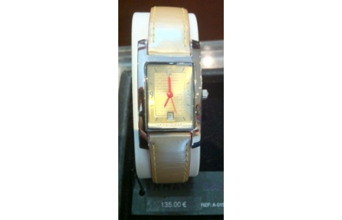 ARMAND BASI MUJER, CORREA DE PIEL CAMEL CON  CAJA CUADRADA DE ACERO, LA ESFERA EN COLOR DORADO Y LAS AGUJAS EN ROJO.